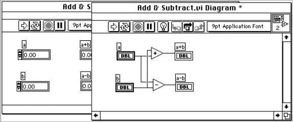 На рис .3. приведены передняя панель и блок-схема простого VI, который вычисляет сумму и разность между двумя числами. На блок-схеме приведены базисные объекты, необходимые для решения задачи - узлы, выходы элементов управления и набора исходных данных, входы индикаторов, и провода.Когда Вы помещаете элемент управления и набора исходных данных, или индикатор на переднюю панель, LabVIEW помещает соответствующий ему пиктограмму входа/выхода в блок-схему. Вы не можете удалить пиктограмму входа/выхода, которая принадлежит элементу управления или индикатору. Пиктограмма исчезнет сама тогда, когда Вы удалите элемент управления или индикатор.