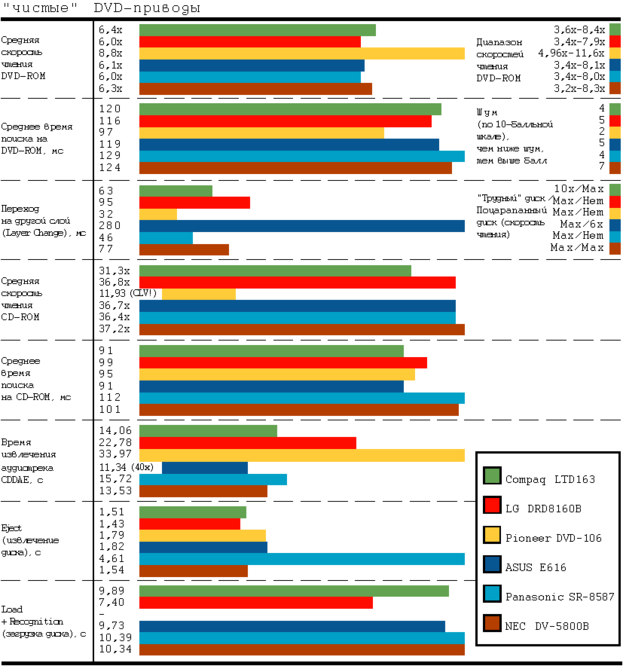 Привод NEC DV-5800B показал довольно хорошие результаты, что в чтении CD-ROM, что в чтении DVD-ROM дисков, он продемонстрировал максимальную скорость чтения поцарапанного CD-ROM диска и, при всем этом, привод практически бесшумный, что является большим плюсом. Все эти характеристики доказывают, что NEC DV-5800B является лучшим из протестированных приводов. Что касается остальных приводов, то для чтения DVD-ROM дисков, и только для этого, большее остальных подходит Pioneer DVD-106. Откровенно неудачно показал себя Panasonic SR-8587, привод плохо справился с чтением DVD-ROM дисков, хотя это его основная задача. Compaq (LiteOn) LTD-163 тоже, как и NEC DV-5800B, показал приемлемые результаты при своей довольно не высокой цене, но у этого привода в отличие от NEC довольно высокий уровень шума.