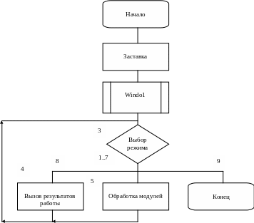 Блок 3 - выбор режима работы. В данном случае обучаемому требуется выбрать один из трех режимов: работа модуля - изучение теории и ответы на контрольные вопросы, Вывод результатов - получение ведомости оценок, конец - выход из программы, т.е. окончание работы с ликвидацией всех ее результатов. Главная программа содержит процедуру VERTIKALNOE_MENU , которая формирует окно меню программы. Процедура написана в графическом режиме. Меню содержит девять разделов, названия которых соответствуют фактическим параметрам упомянутой процедуры. Выбор режима работы, т.е. выбор соответствующего названия раздела осуществляется с помощью условного оператора CASE. В операторе CASE выражением, значение которого вычисляется , является параметр REGIME процедуры VERTIKALNOE__MENU. Он может принимать значения 1 - 9 . На экране это соответствует девять положениям курсора. Таким образом, если параметр REGIME принимает значения 1 - 7 , то далее управление передается модулю с соответствующим именем. На схеме алгоритма -блоку 5 . Если параметр REGIME принимает значение 8, то управление переходит к блоку схемы с номером 4 и производится вывод результатов работы. Если же параметр REGIME равен 9 , то работа с программой заканчивается.