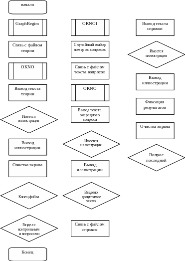 Блок 5 - проверка условия наличия иллюстрации. Эта проверка производится после считывания очередной записи файла теории с помощью условного оператора CASE. С константами оператора сравнивается содержимое поля Р1. В случае наличия иллюстрации она выводится на экран. Если иллюстрация не требуется/то выполняется далее считывание текста теории и после окончания цикла REPEAT очистка экрана.