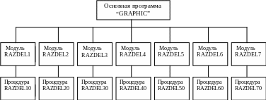 Обучающая программа "Графика" в своем составе содержит основную программу "Graphic" , семь рабочих модулей, один библиотечный модуль. Назначение каждого из них подробно описано в п,3.1. Текст программы приведен в приложении. Структура обучающей программы приведена на рис. 1 Основная программа "Graphic" вызывает на исполнение модули Razdel1 – Razdel7. Каждый модуль содержит по одной процедуре, которые обеспечивают связь с файлами базы данных, вывод текста теории и контрольных вопросов на экран, вывод справок, регистрацию оценок.