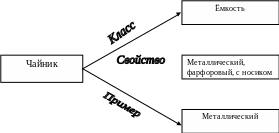 В модели Куиллиана концептуальные объекты представлены ассоциативными сетями, состоящими из вершин, показывающих концепты, и дуг, показывающих отношения между концептами. Например, в сети, показанной на схеме 2, с отношением “класс” ассоциируется значение “ёмкость”, со свойством – “металлический”, “фарфоровый”, “наличие носика”, с примером – “металлический чайник”. Подобная ассоциативная структура называется плоскостью, описываемые концепты объекта называются вершинами типа, а связанные с ними соответствующие отдельные слова – вершинами лексем. В любой плоскости существует одна вершина типа и только необходимое для определения концептов, описывающих его, число вершин лексем.