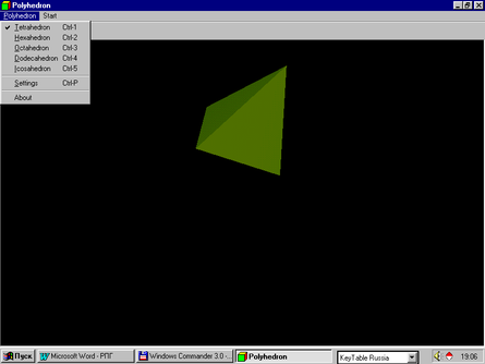 Интерфейс представляет собой стандартное окно Windows, состоящее из панели меню, панели интсрументов и окна представления. На панели меню представлено меню Polyhedron. Это меню представляет собой список из 5 правильных многогранников и пункта Settings, открывающего меню параметров программы. Выбранный многогранник выделяется в этом меню галочкой. На панели инструментов имеется 3 кнопки. Первая кнопка осуществляет запуск движения многогранника, вторая – его остановку, а третья – непосредственное открытие меню параметров Settings.