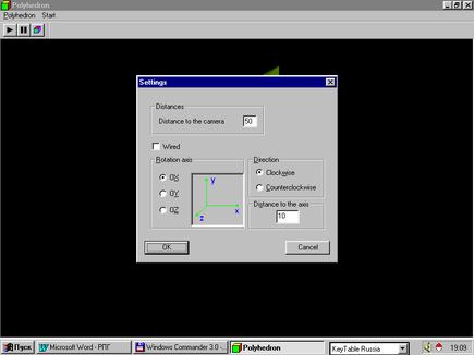 Вначале двигаем камеру на заданное расстояние “к пользователю” по оси OZ для того, чтобы иметь возможность смотреть на платоновое тело “со стороны”, т.к. изначально камера находится в начале координат, где впоследствии и создается тело. Затем сдвигаем начало координат на заданное расстояние относительно заданной оси – оси вращения – для того, чтобы ось вращения была от тела удалена, и создаем платоновое тело. Решение функциональной задачи создания платонового тела интереса не представляет, т.к. с помощью библиотеки OpenGL это делается вызовом всего лишь одной определенной функции. Тело создается в начале координат. После создания платонового тела оно поворачивается относительно оси вращения на определенный угол, значение которого постоянно увеличивается или уменьшается в зависимости от направления вращения. Так как данная последовательность действий выполняется в цикле, тело постоянно сдвигается на все больший (меньший) угол, чем и достигается вращение, в то время как все остальные параметры остаются неизменными.