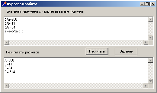 Сначала буквам присваивается значение – например: а=23850934, причем все переменные – целые числа, которые по длине не должны превышать 300 знаков. Потом пишется выражение, например f=(a+b)/c+(d+a). При этом деление – это целое от деления делимого на делитель. Операции сложения, вычитания, умножения – обычные арифметические операции, только это операции над длинными числами. Кроме сложения, вычитания, умножения и деления еще могут быть использованы скобки.