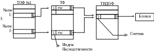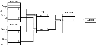 Предположим, есть процесс №1, и с ним ассоциирована таблица открытых файлов №1. В этом процессе открыт файл с именем Name, и этому файлу поставлен в соответствие файловый дескриптор I. Это означает, что в соответствующей строке ТОФ будет запись, имеющая ссылку на ТФ. В ТФ определены какие-то атрибуты, связанные с открытием файла, а также имеется указатель чтения/записи, т.е. тот указатель, по которому мы работаем, обмениваясь информацией с файлом. Записи в ТФ имеют ссылку на ТИДОФ, в которой находится копия ИД, соответствующего файлу с именем Name.