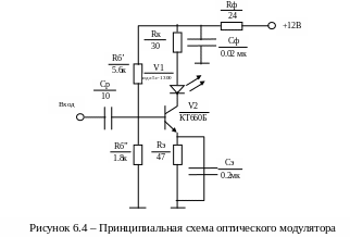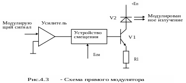 Наиболее простым с точки зрения реализации видом модуляции является прямая модуляция оптической несущей по интенсивности на основе полупроводникового источника излучения. На рис.4.3 представлена схема простейшего прямого модулятора. Здесь исходный сигнал через усилитель подаётся на базу транзистора V1, в коллектор которого включен излучатель V2. Устройство смещения позволяет выбрать рабочую точку на ватт-амперной характеристике излучателя. Именно прямая модуляция используется на городской телефонной сети в системах «Соната-2» и ИКМ-120.