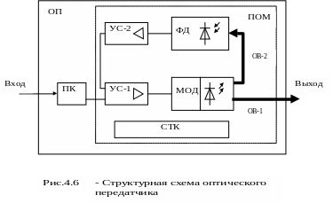 На рис.4.6 представлена структурная схема оптического передатчика (ОП) с прямой модуляцией несущей. Преобразователь кода ПК преобразует стыковой код, в код, используемый в линии, после чего сигнал поступает на модулятор. Схема оптического модулятора исполняется в виде передающего оптического модуля (ПОМ), который помимо модулятора содержит схемы стабилизации мощности и частоты излучения полупроводникового лазера или светоизлучающего диода. Здесь модулирующий сигнал через дифференциальный усилитель УС-1 поступает в прямой модулятор с излучателем (МОД). Модулированный оптический сигнал излучается в основное волокно ОВ-1. Для контроля мощности излучаемого оптического сигнала используется фотодиод (ФД), на который через вспомогательное волокно ОВ-2 подается часть излучаемого оптического сигнала. Напряжение на выходе фотодиода, отображающее все изменения оптической мощности излучателя, усиливается усилителем УС-2 и подается на инвертирующий вход усилителя УС-1. Таким образом, создается петля отрицательной обратной связи, охватывающая излучатель. Благодаря введению ООС обеспечивается стабилизация рабочей точки излучателя. При повышении температуры энергетическая характеристика лазерного диода смещается (рис.4.5), и при отключенных цепях стабилизации мощности уровень оптической мощности при передаче «0» (Р0) и при передаче «1» (Р1) уменьшаются, разность тока смещения Iб и порогового тока Iп увеличивается, а разность Р1-Р0 уменьшается. После времени установления переходных процессов в цепях стабилизации устанавливаются новые значения Iб и Iп и восстанавливаются прежние значения Р1-Р0 и Рср. Для уменьшения температурной зависимости порогового тока в передающем оптическом модуле имеется схема термокомпенсации (СТК), поддерживающая внутри ПОМ постоянную температуру с заданным отклонением от номинального значения. Современные микрохолодильники позволяют получать отклонения не более тысячных долей градуса.