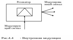 Внутренняя модуляция. В этом случае исходный сигнал управляет параметрами модулятора, введённого в резонатор лазера (рис.4.4).