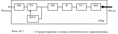 Структурная схема оптического приемника (ОПр) показана на рис.4.7. Приемник содержит фотодетектор (ФД) для преобразования оптического сигнала в электрический. Малошумящий усилитель (УС) для усиления полученного электрического сигнала до номинального уровня. Усиленный сигнал через фильтр (Ф), формирующий частотную характеристику приемника, обеспечивающую квазиоптимальный прием, поступает в устройство линейной коррекции (ЛК). В ЛК компенсируются частотные искажения электрической цепи на стыке фотодиода и первого транзистора усилителя. После преобразований сигнал поступает на вход решающего устройства (РУ), где под действием тактовых импульсов, поступающих от устройства выделения тактовой частоты (ВТЧ), принимается решение о принятом символе. На выходе оптического приёмника имеется преобразователь кода (ПК), преобразующий код линейный в стыковой код.