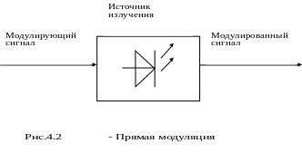 Прямая модуляция. При этом модулирующий сигнал управляет интенсивностью (мощностью) оптической несущей. В результате мощность излучения изменяется по закону изменения модулирующего сигнала (рис.4.2).