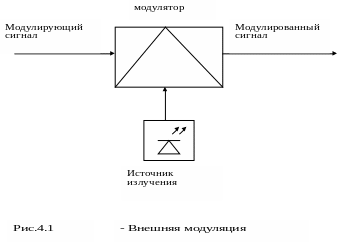 Внешняя модуляция. В этом случае для изменения параметров несущей используют модуляторы, выполненные из материалов, показатель преломления которых зависит от воздействия либо электрического, либо магнитного, либо акустического полей. Изменяя исходными сигналами параметры этих полей, можно модулировать параметры оптической несущей (рис.4.1).