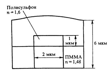 структуры, показанной на рис.2.6. Их структура состоит из четверного слоя InGaAsP толщиной 1мкм и верхнего слоя InP толщиной 1мкм, выращенных методом молекулярно-лучевой эпитаксии из газовых источников. Для удаления полимера с боковых сторон гребня и получения вертикальных боковых стенок волновод толщиной 2,5 мкм глубоко стравливался ниже несущего слоя (примерно на 0,6 мкм) путем многоступенчатого реактивного ионного травления. Параметры структуры были рассчитаны для получения одинаковых постоянных распространения ТЕ- и ТМ-поляризаций. Преимущество структуры с глубоким травлением состоит в том, что двулучепреломление не зависит от глубины травления, а определяется только толщиной волноводного слоя и шириной волновода. Другим ее преимуществом является очень высокая степень ограничения света, что дает возможность использовать изгибы с малым радиусом кривизны (R ~70 мкм) без значительного увеличения потерь. Это позволяет создавать мультиплексоры чрезвычайно малых размеров.