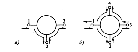 Схема работы простого трехпортового ОЦ (Y-типа) показана на рис.3.1.а. Оптическое излучение, которое поступает через порт 1, выходит через порт 2. Однако излучение, поступающее в обратном направлении через порт 2, направляется в порт 3, а не в порт 1. Поэтому при использовании двух соседних портов ОЦ функционирует как обычный ОИ, а при использовании всех трех портов может осуществляться двунаправленная передача по одному волокну.