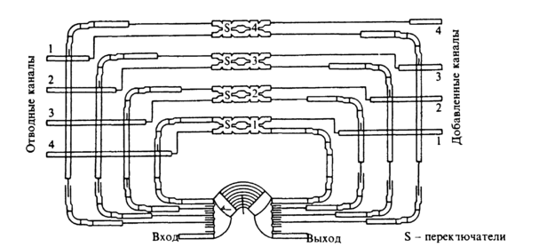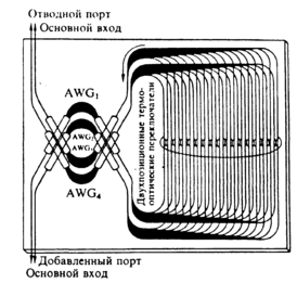 Оптический мультиплексор с добавлением и отводом каналов (МД/О) является устройством, предоставляющим одновременный доступ ко всем каналам на соответствующих длинах волн в системах связи с ВСМ/Д. В англоязычной литературе используется терминология Add/ Drop Multiplexer (A/DM). На рис. 2.12 приведена конфигурация такого волноводного 16-ти канального оптического мультиплексора. Его устройство состоит из четырех ВСМ/Д и 16-ти двухпозиционных термооптических (ТО) переключателей.