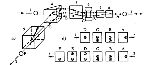 Структура устройства и положение поляризационных компонентов показаны на рис. 3.2, где 1, 2, 3 - волоконные коллиматоры; 4 - специальная поворотная призма со щелью; 5, 7, 8, 9 - двулучепреломляющие элементы из кристалла рутила; 6 - 45-градусный фарадеевский вращатель из кристалла иттрий-железного граната. Принцип работы ОЦ заключается в следующем.