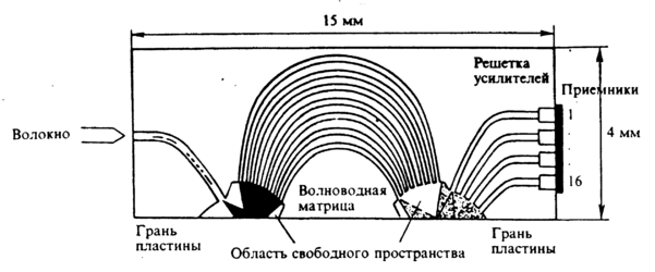 Интеграция ВСМ и фотоприемников. Четырехканальный демультиплексор с малыми потерями был монолитно интегрирован с фотодетекторами. Демультиплексор состоял из диспергирующей волноводной системы, соединенной с планарными фокусирующими областями (рис. 2.11).
