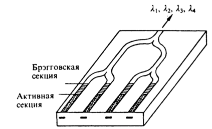 Интегральные источники излучения. На передающих станциях излучение от матрицы лазеров, работающих на длинах волн n. должно быть объединено в один канал для ввода в волоконный световод оптической линии связи. Это может быть осуществлено путем использования матрицы из Y-соединителей. путем соединения излучения лазеров с помощью ВСМ. объединения усилителей и ВСМ в единый интегральный блок с одним выходным каналом, а также другими способами.