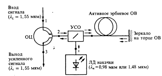 Схема волоконно-оптического усилителя отражательного типа, в котором используется оптический циркулятор, показана на рис.3.3. При такой схеме эффективность действия накачки в активном эрбиевом волокне увеличивается в два раза.