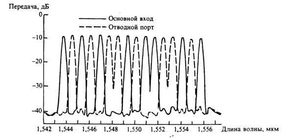 канала на 9 нм. Главным образом это было следствием различия между спроектированной и изготовленной волноводными структурами. Потери составили 7 … 9 дБ, остаточный сигнал в полосе соседнего сигнала оказался примерно па 30 дБ ниже исходного сигнала. Эти значения находятся в хорошем согласии с рассчитанными.