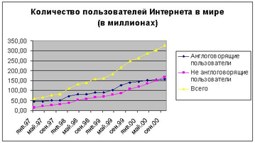 Согласно Internet Industry Almonac к концу 2000 г. количество пользователей Интернета превысит 327 миллионов [25]. Заметим, что в конце 1997 г. эта цифра равнялась всего 100 миллионам. В таблице 1 приведены данные Global Reach (агентство маркетинговых коммуникаций) об изменении количества пользователей каждые три месяца в течение 1997-2000 г.г.