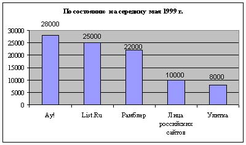 На конец мая 1999 г. наибольшее число сайтов - около 28000 - было зафиксировано каталогом ресурсов “Ау!-@Rus”, при этом, правда, отмечалось, что только 19500 из них были доступны. Более 25 тысяч сайтов было представлено в каталоге “List.Ru”, в котором ежедневно добавляется 30-100 новых имен. О высоком темпе роста Сети говорят и следующие факты. Поисковая система “Лица российских сайтов” в конце 1998 г. архивировала порядка 7000 сайтов, а в середине мая 1999 – около 10000. Каталог российских ресурсов – “Улитка” осенью 1998 г. насчитывал свыше 4000 домашних страниц, а к середине мая 1999 г. – почти 8000 сайтов (рисунок 4) [6].