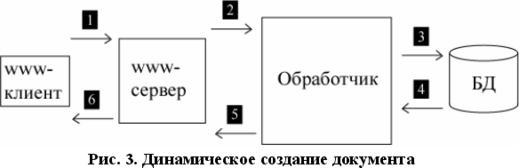 В этом варианте доступ к БД осуществляется специальной CGI-программой, запускаемой WWW-сервером в ответ на запрос WWW - клиента. Эта программа, обрабатывая запрос, просматривает содержимое БД и создает выходной HTML-документ, возвращаемый клиенту. (см. рис. 3)