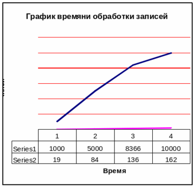 Тестирование программы проводилось на 4 массивах данных размером 1000, 5000, 8366, 10000 записей. Метод тестирования заключался в поиске последней записи массива по уникальному названию, чтобы определить время поиска по всему массиву. Полученные данные приведены в таблице и на основе данных построен график (см. график).