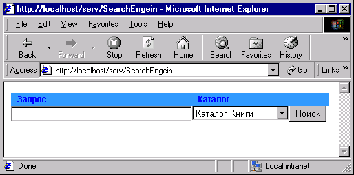 Программа начинает работать после того когда от клиента приходит запрос на страницу по определенному URL (например: http://www.real.ulan-.ude.ru/serv/SearchEngein), для выполнения запроса пользователя веб-сервер запускает JServ, который в свою очередь обрабатывает запрос и определяет какой именно сервлет требуется запустить и в какой зоне он находится. Информацию о зонах размещения всех сервлетов Jserv считывает из файла настройки. Чтобы сервлет начал выполняться JServ предварительно запускает виртуальную Java машину и только после этого начинает работать сервлет это значит что запрос пользователя будет обработан и пользователь получит запрошенную страничку. Что же происходит на стороне сервера в этот момент когда пользователь ждет пока загрузится страница. А происходит вот что, управление по отображению всей информации в окне браучера переходит сервлету, программе написанной на Java. Рассмотрим это более детально. Сервлет инициализируется и начинает передачу данных в формате HTML пользователю. Первое что увидит пользователь это будет поисковая форма (см. рис. 6) .