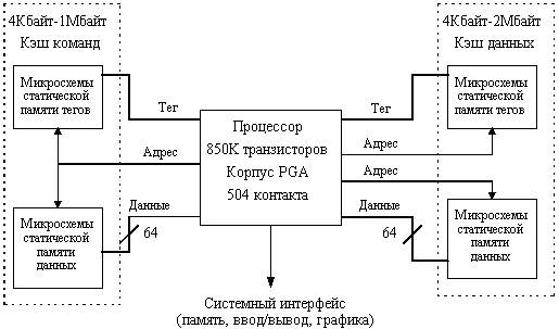 компании Hewlett Packard Основой разработки современных изделий Hewlett-Packard является архитектура PA-RISC. Она была разработана компанией в 1986 году и с тех пор прошла несколько стадий своего развития благодаря успехам интегральной технологии от многокристального до однокристального исполнения. В сентябре 1992 года компания Hewlett-Packard объявила о создании своего суперскалярного процессора PA-7100, который с тех пор стал основой построения семейства рабочих станций HP 9000 Series 700 и семейства бизнес-серверов HP 9000 Series 800. В настоящее время имеются 33-, 50- и 99 МГц реализации кристалла PA-7100. Кроме того выпущены модифицированные, улучшенные по многим параметрам кристаллы PA-7100LC с тактовой частотой 64, 80 и 100 МГц, и PA-7150 с тактовой частотой 125 МГц, а также PA-7200 с тактовой частотой 90 и 100 МГц. Компания активно разрабатывает процессор следующего поколения HP 8000, которые будет работать с тактовой частотой 200 МГц и обеспечивать уровень 360 единиц SPECint92 и 550 единиц SPECfp92. Появление этого кристалла ожидается в 1996 году. Кроме того, Hewlett-Packard в сотрудничестве с Intel планируют создать новый процессор с очень длинным командным словом (VLIW-архитектура), который будет совместим как с семейством Intel x86, так и семейством PA-RISC. Выпуск этого процессора планируется на 1998 год. 1.3 Характеристика процессоров на основе архитектуры PA-RISC 1.3.1 Характеристика и особенности процессора PA 7100 Особенностью архитектуры PA-RISC является внекристальная реализация кэша, что позволяет реализовать различные объемы кэш-памяти и оптимизировать конструкцию в зависимости от условий применения (рисунок 1.3.1). Хранение команд и данных осуществляется в раздельных кэшах, причем процессор соединяется с ними с помощью высокоскоростных 64-битовых шин. Кэш-память реализуется на высокоскоростных кристаллах статической памяти (SRAM), синхронизация которых осуществляется непосредственно на тактовой частоте процессора. При тактовой частоте 100 МГц каждый кэш имеет полосу пропускания 800 Мбайт/с при выполнении операций считывания и 400 Мбайт/с при выполнении операций записи. Микропроцессор аппаратно поддерживает различный объем кэш-памяти: кэш команд может иметь объем от 4 Кбайт до 1 Мбайт, кэш данных - от 4 Кбайт до 2 Мбайт. | ||||||