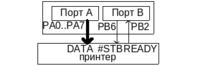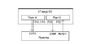 Вариант соединения Atmega163 с посимвольным принтером, имеющим 8-битный вход для приема данных DATA, выход сигнала готовности READY и вход стробирования #STB. Активным на входе стробирования является сигнал низкого уровня. Порт А микроконтроллера и бит РВ6 порта PORTB программируются на вывод данных, бит PB2 порта PORTB на ввод. Подпрограмма вывода должна: осуществлять проверку готовности принтера, при обнаружении сигнала READY=1 вывести данные в порт PORTА, подтвердить вывод данных выводом сигнала стробирования #STB=0 для записи данных в принтер. Если принтер не готов к обмену микроконтроллер через заданный интервал времени повторяет операцию.