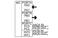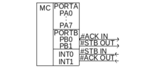 Рис . 9.4. Подключение микроконтроллера при дуплексном обмене В схеме на рис . 9.4 порт PORTA работает на ввод данных , порт PORT – на вывод , а линии PC0 и PC порта PORTC использованы для вывода сигналов квитирования #ACK IN и #ACK OUT. Для ввода сигналов квитирования от объекта #STB IN и #ACK OUT использованы входы запросов на прерывания INT0 и INT . При таком подключении задача ввода данных в микроконтроллер получает больший приоритет чем задача вывода .