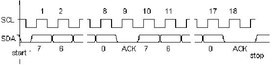 При передаче данных состояние линии SDA может изменяться только при низком уровне SCL. Биты данных стробируются положительным фронтом SCL.
