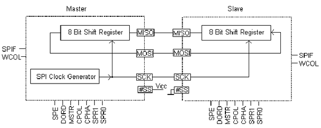 Регистры сдвига (Shift Register) ведущего и ведомого контроллеров по линиям MOSI и MOSO соединяются в кольцо. Запись в регистр данных ведущего контроллера запускает генератор синхронизации (SPI clock generator) и данные сдвигаются в регистрах сдвига соединенных в кольцо ведущего и ведомого контроллеров.