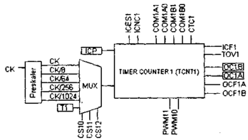 Регистры выходов сравнения OCR1AH и OCR1AL , OCR1BH и OCR1BL образуют два 16-разрядных регистра OCR1A и OCR1B. OCR1A и OCR1B 16-битные то для обеспечения одновременного занесения старшего и младшего байтов данных в регистры OCR1A/B используется регистр временного хранения TEMP.