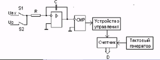 нтервал времени T1 задается включением ключа S1. По окончании T1 ключ S1 размыкается, a S2 - замыкается. Опорное напряжение U0 должно иметь знак противоположный знаку напряжения входного. Компаратор, устройство управления и счетчик определяют выходной код D, пропорциональный интервалу T2.