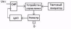 сновными элементами преобразователя (рис. 2) является регистр последовательных приближений, код из которого с помощью цифроаналогового преобразователя преобразуется в напряжение. Компаратор СМР сравнивает входное напряжение с выходным напряжением преобразователя и через устройство управления воздействует на регистр.