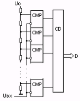 В параллельном преобразователе (рис. 1) входной сигнал подается сразу на множество компараторов, осуществляющих сравнение сигнала с опорным напряжением. Опорные напряжения формируются цепочкой резисторов, делящих эталонное напряжение U0 на равные части.