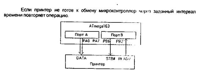 На рис. 9.2 показан вариант соединения микроконтроллера ATmega163 с посимвольным принтером, имеющим 8-битный вход для приема данных DATA, выход сигнала готовности READY и вход стробирования #STB. Активным на входе стробирования является сигнал низкого уровня.