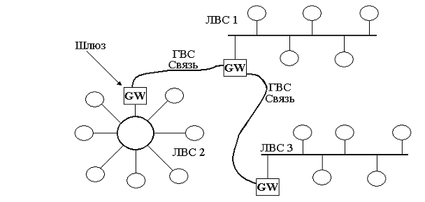 На рис.2 показаны три ЛВС, соединенные посредством двух связей глобальной вычислительной сети (ГВС). Узлы каждой ЛВС могут контактировать друг с другом непосредственно. Когда же узел ЛВС 1 связывается с узлом ЛВС 3, данные должны пройти через два шлюза. Узлы различных ЛВС должны иметь информацию о наличии шлюза и при необходимости взаимодействовать с ним. Другое общепринятое название шлюза  маршрутизатор. Однако при использовании данного термина следует помнить, что любой маршрутизатор является шлюзом, но не всякий шлюз является маршрутизатором.