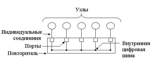 Т-образным связям. Каждый узел присоединяется к концентратору отдельным кабелем (рис. 4). Внутри концентратора имеется цифровая шина, к которой через порт повторителя присоединяются все узлы. Внутренняя цифровая шина занимает место, отведенное коаксиальному кабелю в шинной сети. Порты повторителя предназначены для выполнения тех же функций, что и повторители шинной (рис. 5). Различие между ними заключается в том, что концентратор имеет не два, а много (до 32) портов. В случае сети Ethernet эта технология называется 10Base-Т, а в случае Fast Ethernet  100Base-T .