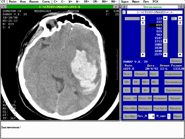 | Окно Управление | является основным окном при работе с 2D изображениями и позволяет управлять вводом изображений с томографа, преобразованием данных во внутренний формат и вызывает приложения, работающие вне оболочки, такие как работа с стримером, с факс-модемом, монитором, базой данных, Нортон-командером и архивом; управляет печатью изображений и диагностических заключений на лазерном принтере и настройкой параметров печати изображения. |