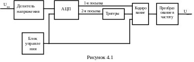 Измеряемое напряжение поступает на вход делителя напряжения, предназначенного для согласования уровня входного сигнала с входом АЦП. Преобразованное напряжение поступает на АЦП, с выхода которого часть двоичного кода, соответствующая первой посылке, сразу же подаётся на блок кодирования (блок логических устройств), а остальная часть – на триггеры, выступающие в роли регистра. Блок регистров предназначен для хранения двоичного кода в то время, когда выходы АЦП находятся в Z – состоянии, что позволяет осуществлять беспрерывную передачу. С выхода блока регистров двоичный код поступает на логический блок (блок кодирования), где происходит преобразование двоичного кода в неприводимый сменно-посылочный код. Сигналы с выхода логического блока поступают на блок преобразования в частоту логических сигналов, где находятся генераторы частоты, ключи включения генераторов, полосовые фильтры и сумматор. Колебания с выходов полосовых фильтров поступают на сумматор, с выхода которого в линию поступает выходной сигнал. Работой вышеперечисленных блоков управляет блок управления, который должен производить следующие операции: