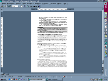 Функция Print Preview (Предварительный просмотр) осуществляет вывод на экран документа в том виде, в котором он будет выведен на печать. При помощи функции Print Preview (Предварительный просмотр) на экран можно вывести одновременно несколько страниц документа и внести изменения в их параметры (например, увеличить или уменьшить размеры страницы), а также проверить правильность и, при необходимости, - изменить параметры форматирования текста.