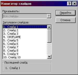 В поле Последний слайд, расположенном в нижней части диалогового окна Навигатор слайдов, отображается заголовок и номер слайда который в настоящий момент демонстрируется аудитории. Если вы хотите пропустить какие-то слайды, нужно прокрутить список слайдов в диалоговом окне Слайды и найти нужный. Выделив слайд, вы можете предварительно просмотреть его в поле, расположенном в правой части диалогового окна.