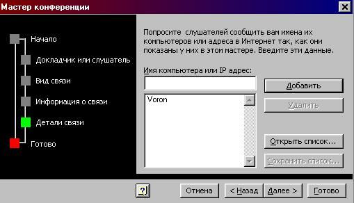 Четвертое диалоговое окно. В текстовом поле Имя компьютера введите имя любого компьютера , участвующего в конференции, и нажмите кнопку Добавить. Имя будет внесено в список, расположенный под этим полем. Продолжайте добавлять имена, пока не перечислите все компьютеры. Если имя добавлено по ошибке или нужно удалить имя компьютера, принадлежащего отсутствующему участнику, выделите это имя в списке диалогового окна и нажмите кнопку Удалить. Когда список компьютеров будет готов , нажмите кнопку Готово, чтобы открыть конференцию.
