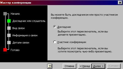 Имея на руках список имен, откройте презентацию, предназначенную для демонстрации. Затем выберете команду Конференция в меню Сервис. На экране появится первое окно диалога Мастер конференции. Здесь организатор конференции должен выбрать Докладчик, а участник должен выбрать Участник конференции и нажать кнопку Далее.