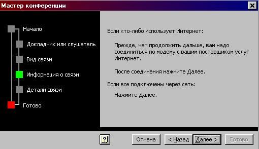 В третьем диалоговом окне указано какой тип связи вы используете, так как мы рассматриваем конференцию в локальной сети, то можно сразу нажимать Далее, если вы хотите использовать интернет , то сначала надо соединиться по модему с вашим поставщиком услуг Интернет.