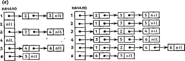 данных, которую мы будем называть списками инцидентности. Она содержит для каждой вершины v C V список вершин и, таких что v -> u (или v — ив случае неориентированного графа). Точнее, каждый элемент такого списка является записью г, содержащей вершину г. строка и указатель г. след на следующую запись в списке (г. след = nil для последней записи в списке). Начало каждого списка хранится в таблице НАЧАЛО; точнее, HAЧАЛО[v] является указателем на начало списка, содержащего вершины из множества {u: v+u} ({u: v - u} для неориентированного графа). Весь такой список обычно неформально будем обозначать 3AПИСЬ[v], а цикл, выполняющий определенную операцию для каждого элемента и из этого списка в произвольной, но четко установленной последовательности, соответствующей очередности элементов в списке, будем записывать «for u C ЗАПИСЬ [v] do ...».