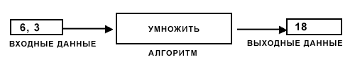 Теперь можно поставить вопрос: а может ли человек обрабатывать информацию ? Конечно, может. В качестве примера можно привести обычный школьный урок: учитель задает вопрос ( входные данные ), ученик отвечает ( выходные данные ). Самый простой пример: учитель дает задание – умножить 6 на 3 и результат написать на доске. Здесь числа 6 и 3 – входные данные, операция умножения – алгоритм, результат умножения – выходные данные: